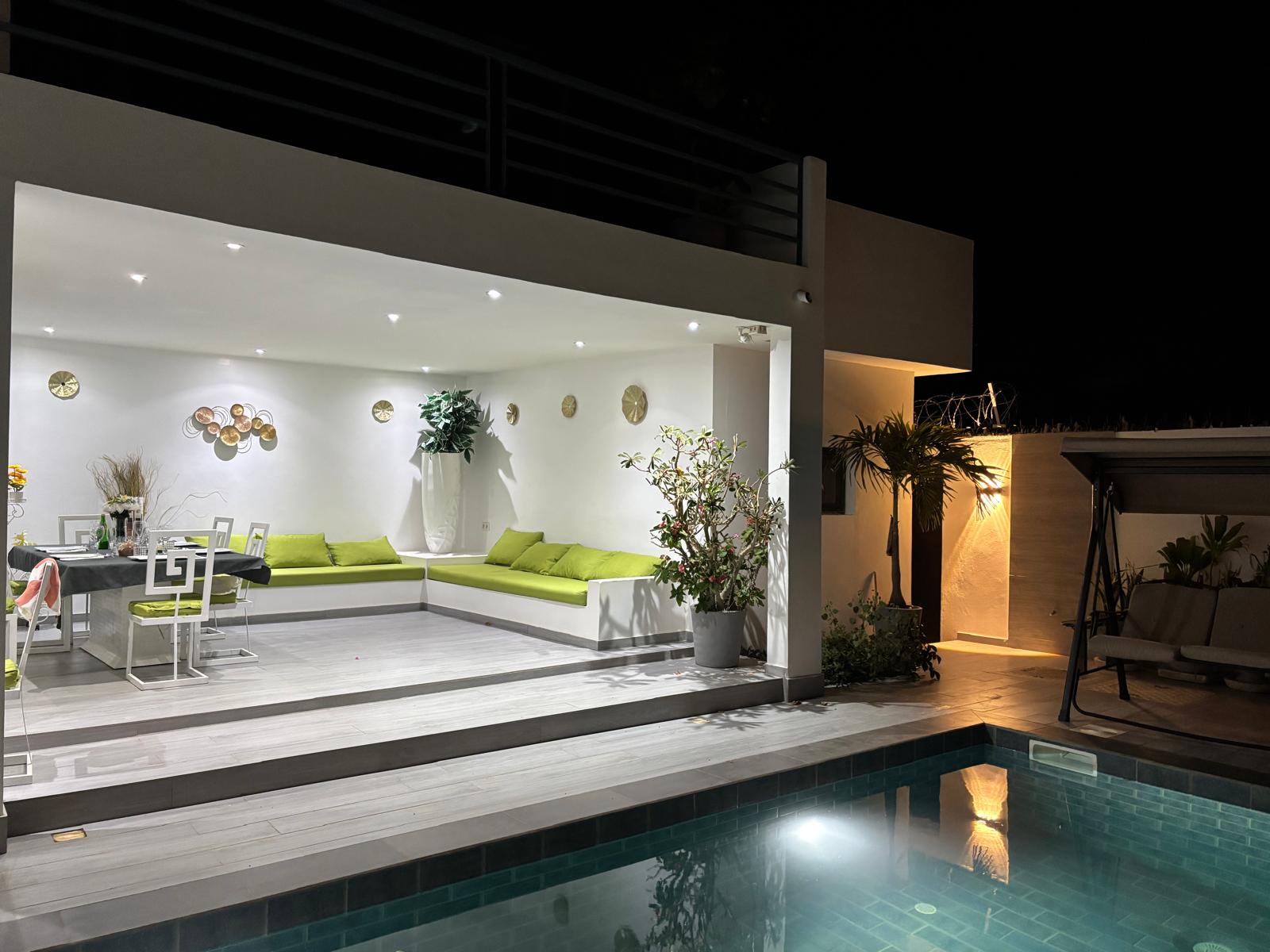 Les repas se prennent autour de la piscine, sous le pool house ou en salle selon le temps.